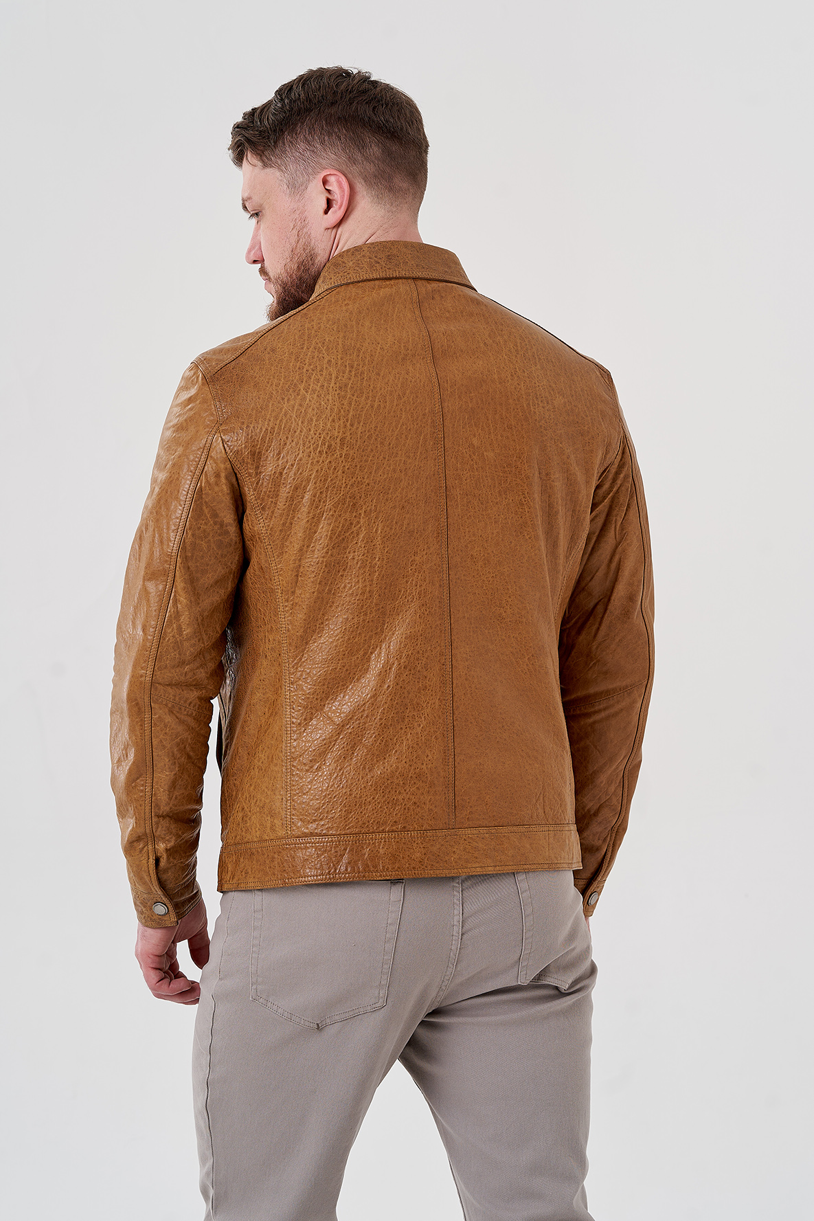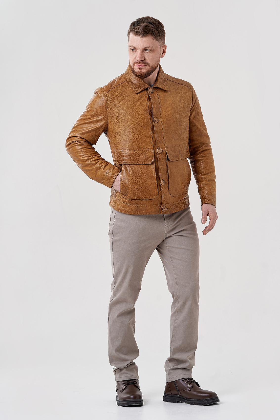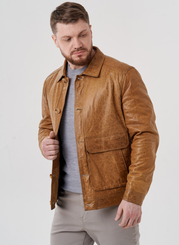Мужская куртка бежевого цвета. Выполнена из натуральной кожи с оригинальным тиснением. Подклад из полиэстера. Застегивается на пуговицы. Для удобства расположены карманы с клапанами. Отложной воротник и застежки на кнопки на рукавах. Длина 70 см кофмортная и не будет стеснять движений.