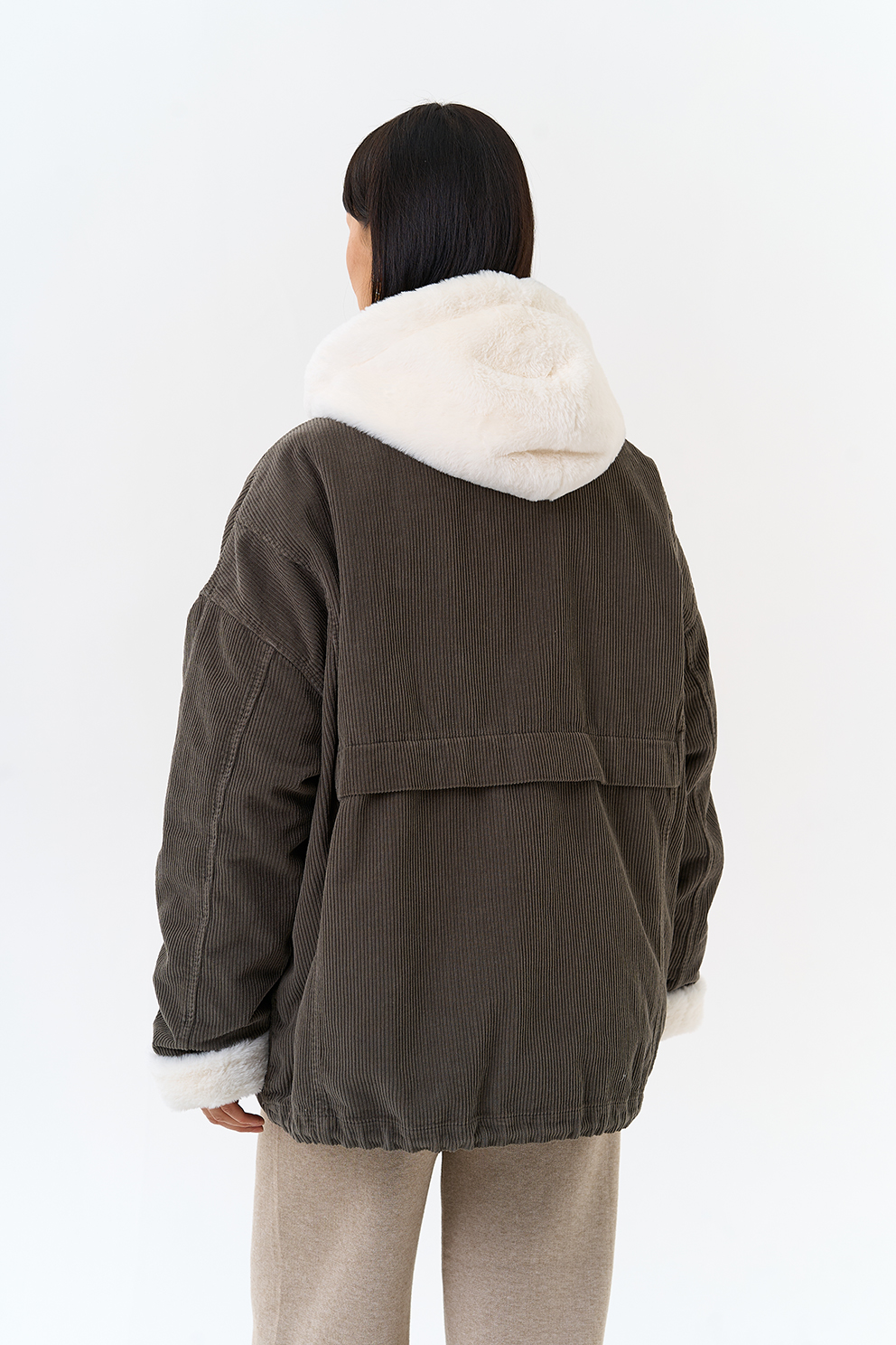 Крой воротника - съемный капюшон, отделка эко мех