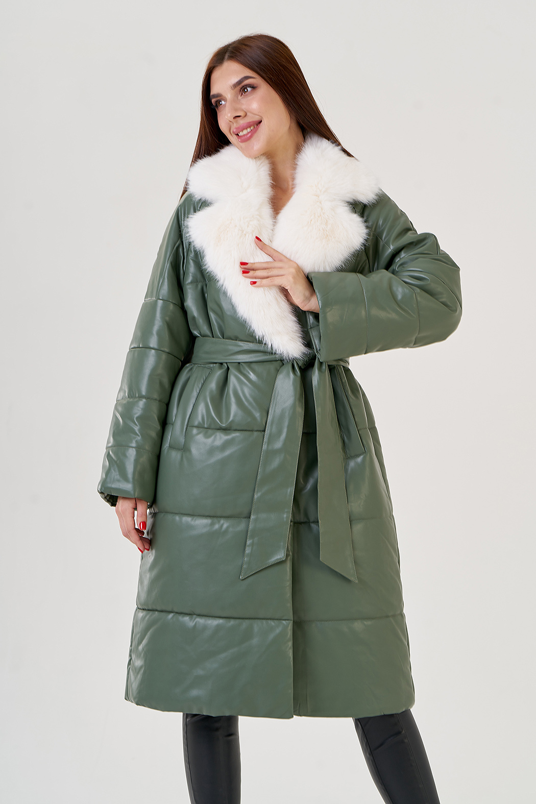 Пуховик в зеленом цвете с воротником из эко меха. Модель выполнена из эко кожи, что позволяет ей быть прочной и эластичной. Меховой воротник отстегивается. Английский ворот подчеркнет вашу шею. По бокам имеются прорезные карманы. В комплекте идет пояс из материала верха.